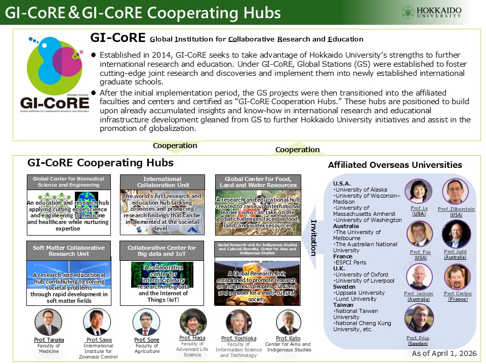 The Global Institution for Collaborative Research and Education (GI-CoRE) is a faculty organization under the direct control of the Hokkaido University President that brings together distinguished researchers from around the world to conduct collaborative research and education with scholars at Hokkaido University. Under the GI-CoRE system, research hubs known as “Global Stations (GS)” across different research fields were actively being launched until the end of FY2025 when the program came to a close. Each GS had an implementation period of five years to conduct intensive research and education activities. Through the GI-CoRE system, scholars from partner institutions were invited to engage in research activities at Global Stations and granted special provisions related to salary, travel expenses, and exemption from administrative responsibilities. After the initial implementation period, the GS projects were then transitioned into the affiliated faculties and centers and certified as “GI-CoRE Cooperating Hubs” (as listed below). These hubs are now expected to continue the research from each GS, in cooperation with GI-CoRE, and produce actionable results based on their findings.