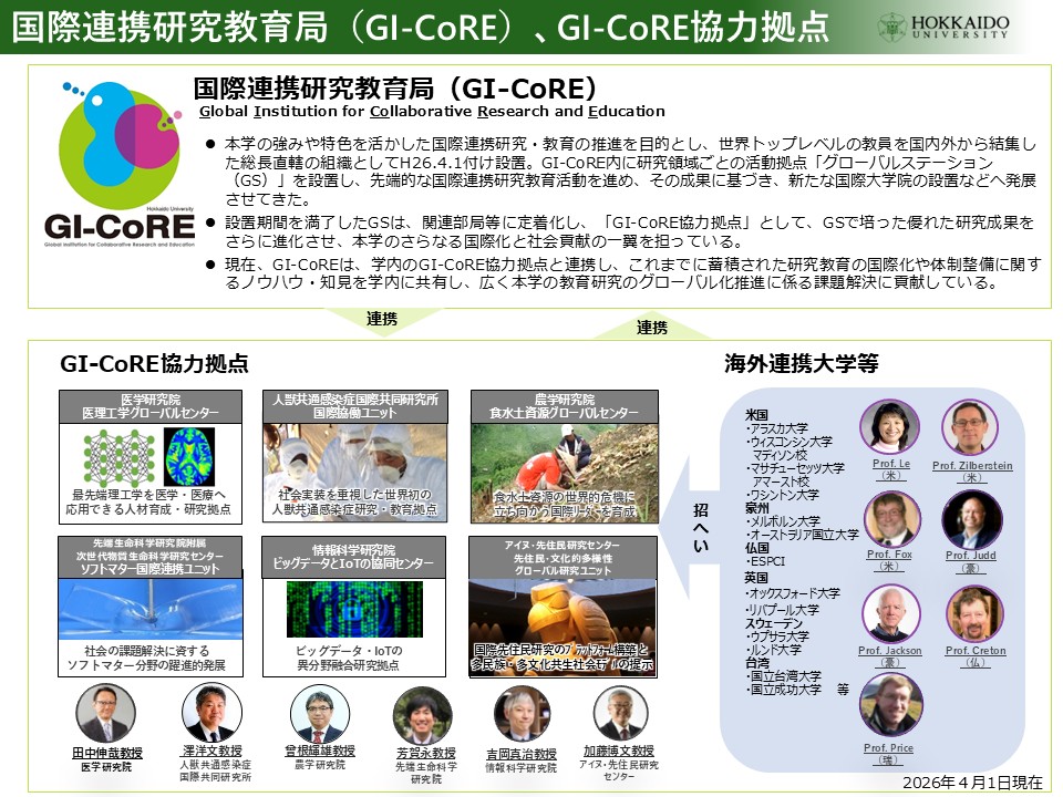 国際連携研究教育局(GI-CoRE)は、北海道大学の強みや特色を活かした国際連携研究・教育の推進と部局が独自に進める国際連携研究・教育の支援を目的とし、世界トップレベルの教員を国内外及び学内から結集した総長直轄の教員組織です。 GI-CoRE内には、研究領域ごとの活動拠点である「グローバルステーション(GS)」を置き、各GSにおいて、原則5年間の設置期間内に重点的に研究教育活動を進めています。 GI-CoREでは、連携機関から招へいした教員に特例措置(給与、旅費、管理運営業務の免除等について特別な待遇)を定めています。 また、設置期間を満了したGSは、関連部局等に定着化し、「GI-CoRE協力拠点」の認定を受け、GI-CoREと連携しながら研究教育活動を継続しています。(下記参照)